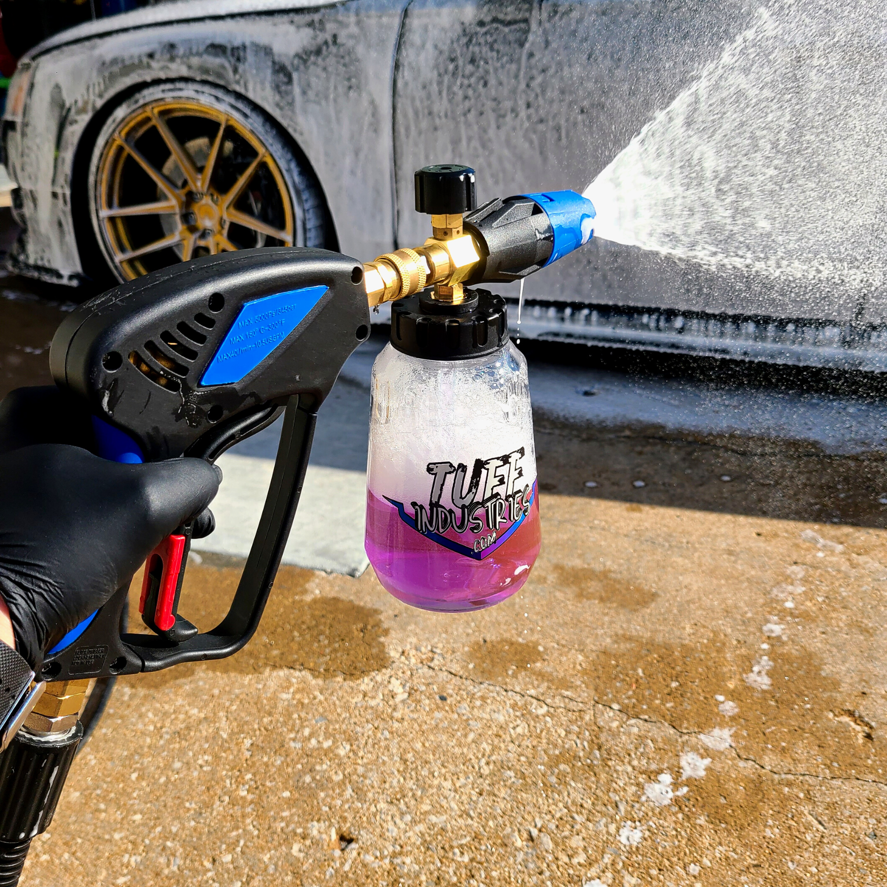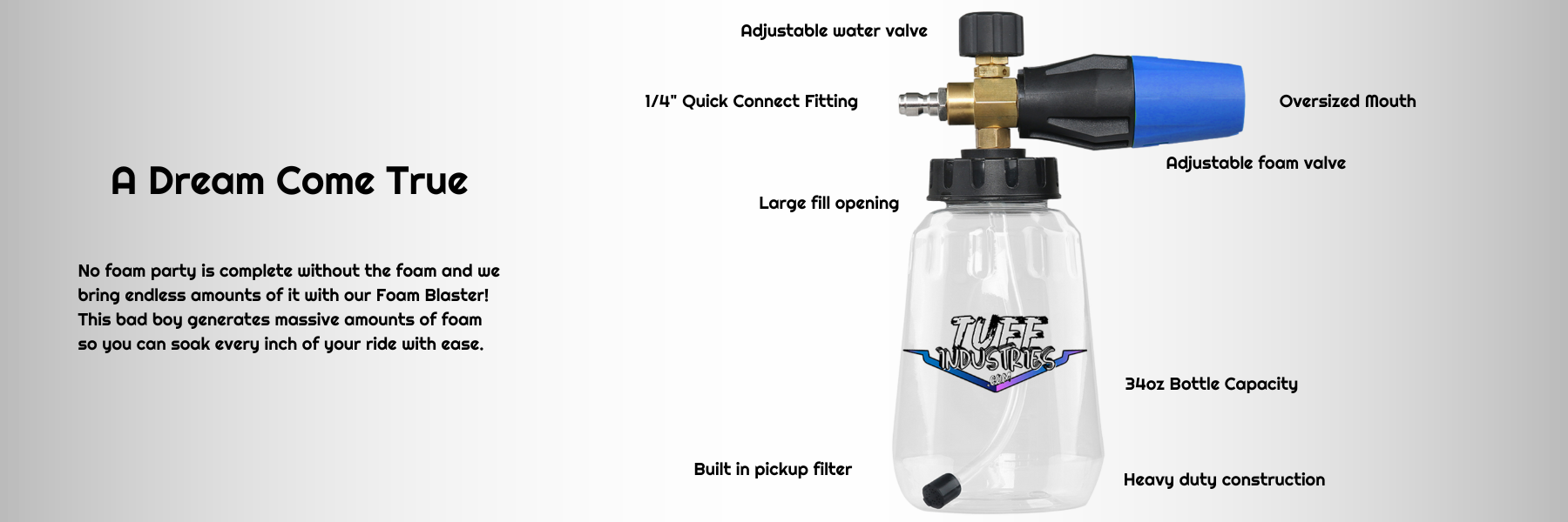 The Foam Blaster generates a massive amount of foam from its oversized mouth making sure you soak every inch or your ride! The heavy-duty clear bottle makes mixing your water and shampoo easier than ever with its wide opening. Using a foaming shampoo in our foam cannon means more lubrication for a scratch free washing experience. Employ the power of foam break down and lift dirt, mud, bugs, salt and other grime so you can easily wash them away. Use with our Pressure Washer Gun for ultimate control and maximum foam!