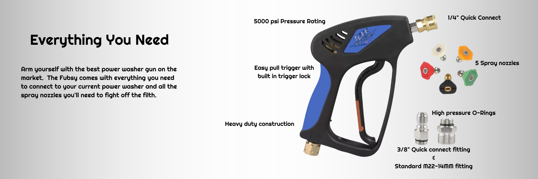 Constructed with premium materials, The Fubsy's heft and build quality are immediately noticeable – a testament to its tank-like durability. This tool is designed to endure the toughest conditions, resilient against drops and capable of operating under extreme pressure without faltering. With a capacity to handle up to 5000psi, The Fubsy ensures you have the power you need for the most demanding cleaning tasks.