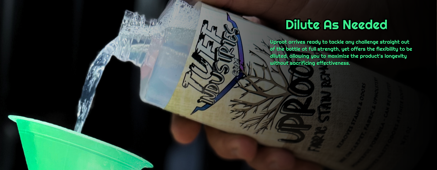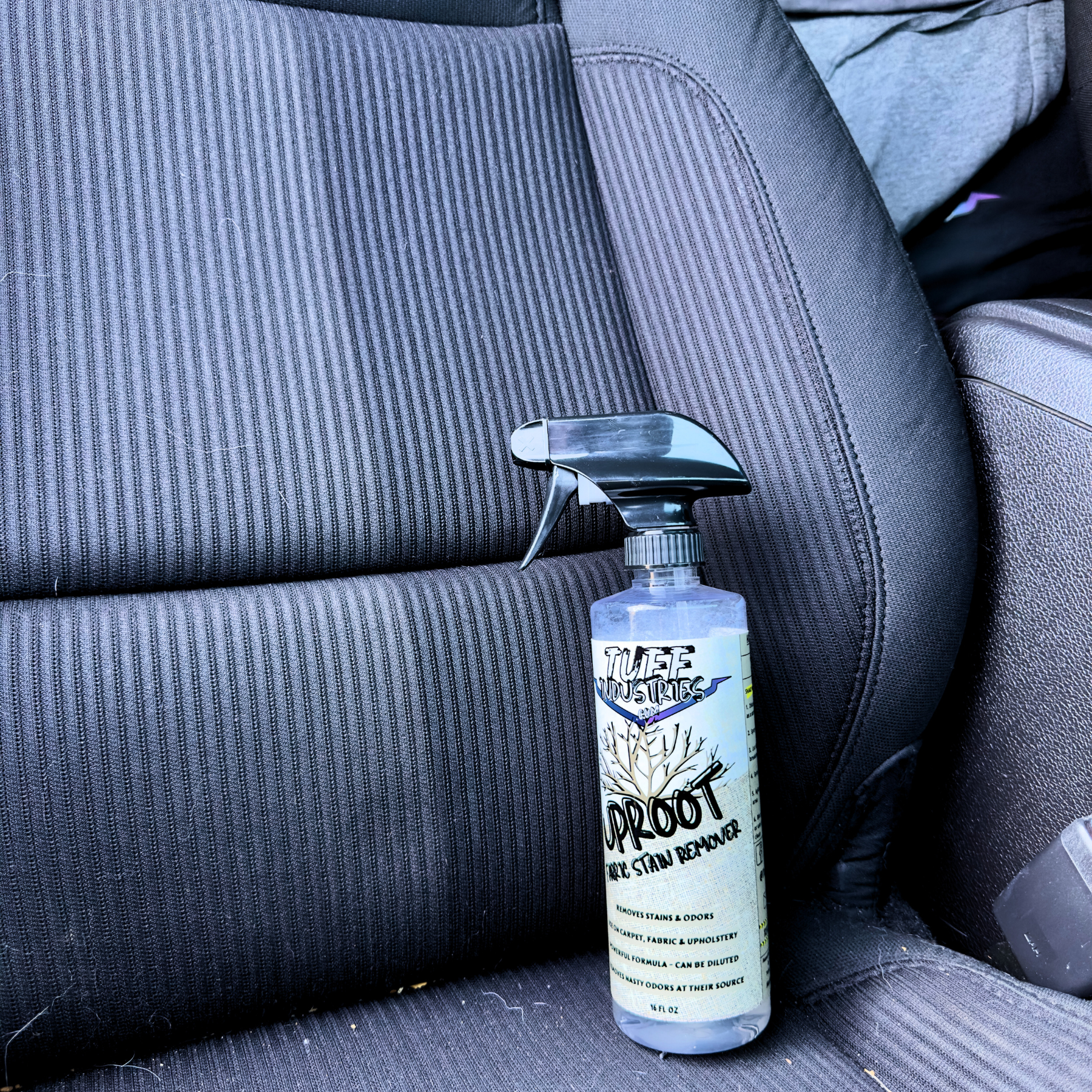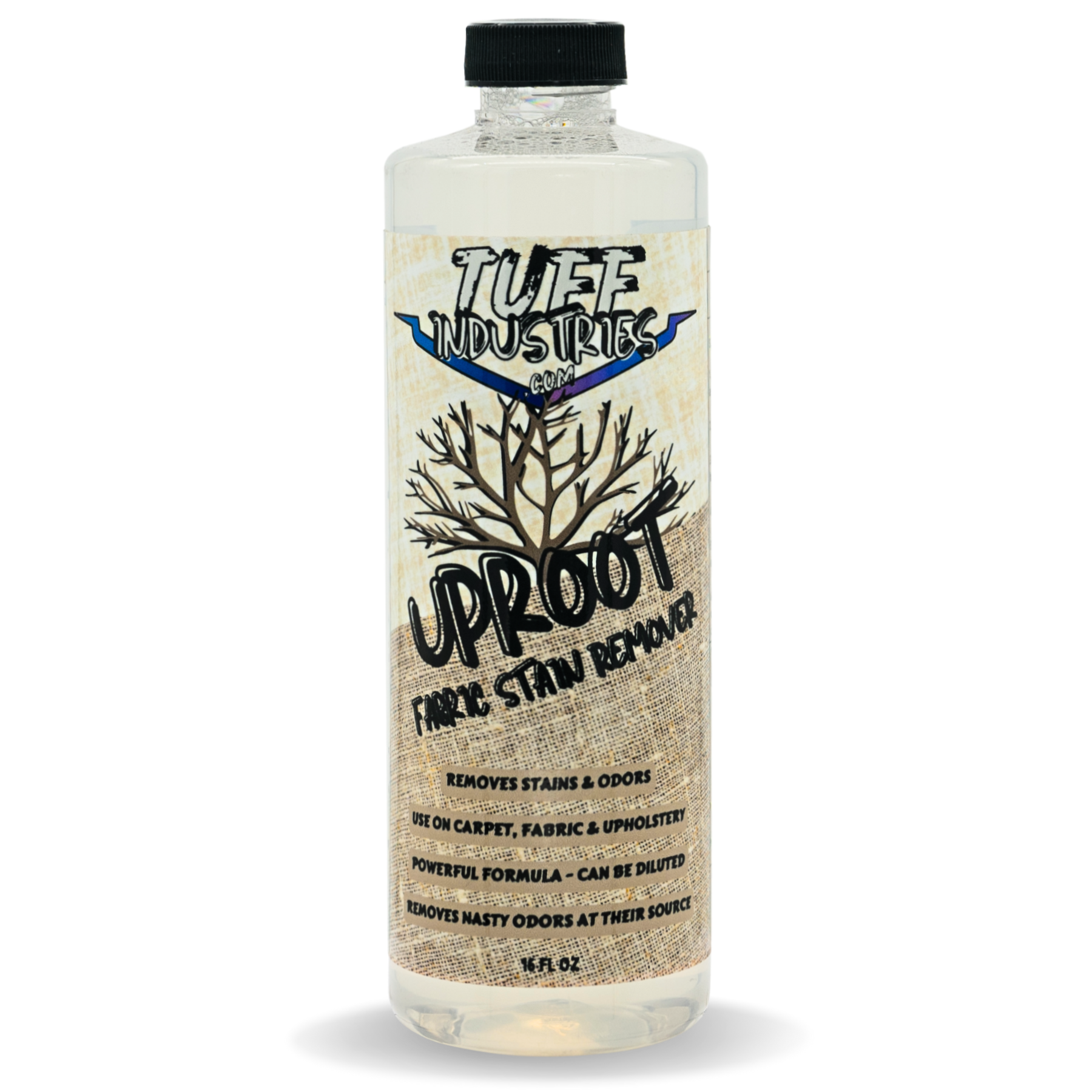 Uproot, the ultimate fabric and upholstery stain remover designed to conquer the most stubborn stains on any fabric surface. Whether you're dealing with a fresh spill or an old, set-in mark, Uproot's advanced formula is engineered to break down stains at the molecular level, preparing them for complete removal from your fabrics and upholstery. Uproot arrives ready to tackle any challenge straight out of the bottle at full strength, yet offers the flexibility to be diluted, allowing you to maximize the product's longevity without sacrificing effectiveness.